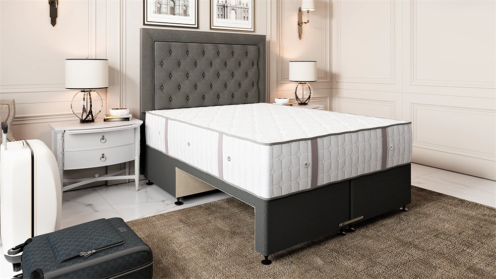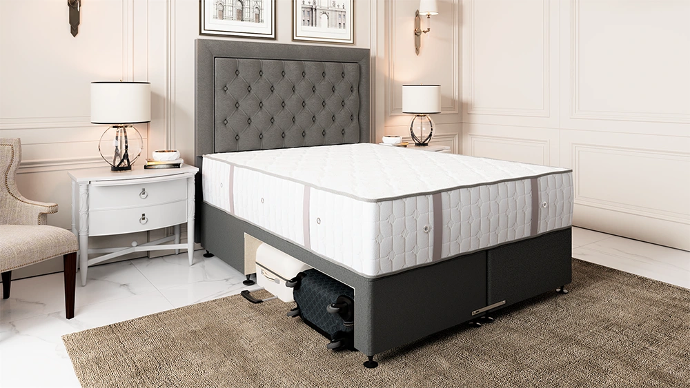 A Suitcase Base for Briody Beds is a type of divan bed base that includes a space underneath the mattress platform specifically designed for storing suitcases (or other bulky items), with a flap to access it.